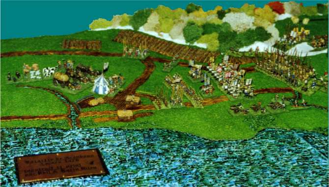 Die Schlacht von Grandson mit 15mm Figuren, ausgestellt im Schloss Grandson während des ersten Swiss opens im Sommer 1999