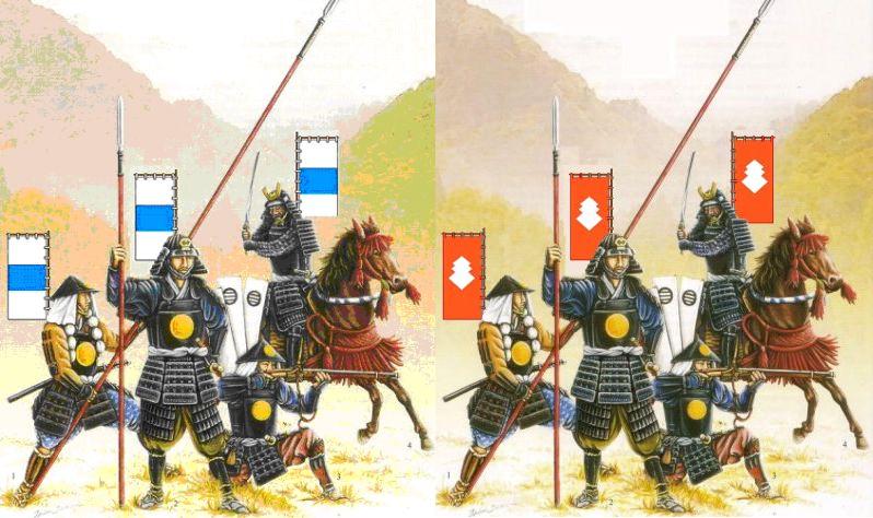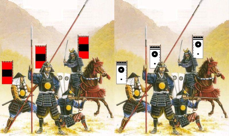 Japans Reichseinigungskriege 1467 - 1616Die von den Japanern Sengoku-jidai genannte Epoche wird bei uns als: Zeit der streitenden Reiche übersetzt und mit der Zeitspanne von 1477-1573 bemessen. In der damaligen Hauptstadt Kyoto wütete zuvor der 10-jährige Onin-Krieg. Das dadurch entstandene Machtvakuum löste im ganzen Land verheerende Machtkämpfe aus. Jeder lokale Landesfürst, Daimyo genannt, versuchte auf Kosten seiner Nachbarn seine Machtsphäre zu erweitern.Dazu kam, dass Japan seit Jahrhunderten Kaiser hatte, ausserdem auch einen obersten Kriegsherrn, den Shogun. Erst 1603 mit der Machtergreifung von Tokugawa Ieyasu wurde das Shogunat von dessen Familie langfristig neu besetzt. Mit dem Tod von Tokugawa Ieyasu endete auch die Epoche der streitenden Reiche. Das ganze Kastengefüge der japanischen Gesellschaft war damals schon Jahrzehnte, wenn nicht schon länger in Schieflage geraten. Die weitgehend überschuldete Kriegerkaste der Samurai lebte auf Kosten der niedriger gestellten Kaste der Bauern. Vom stolzen berittenen Bogenschützen entwickelten sich verarmte Samurai zum Fussvolk. Vielerorts kam es zu heftigen Bauernaufständen, der so genannten Ikko-Ikki-Bewgung, die eine kastenlose Gesellschaft forderte und von Mönchen getragen wurde, die dadurch auch ihrem Stand mehr Gewicht verleihen wollten. Erst 1580 gelang es Oda Nobunaga diese militante Bewegung zu zerschlagen. 1573 entmachtete Oda Nobunaga den seit längerem schon bedeutungslosen Ashikaga-Shogun formell und wurde bis zu seinem Tod 1582 zu einem der bedeutendsten Herrscher im Land. Danach kam der aus dem Bauernstand stammende Toyotomi Hideyoshi an die Macht. Von seiner Burg in Osaka aus beherrschte er Japan bis zu seinem Tod 1598. Erst da wurde der Weg frei für Tokugawa Ieyasu, der alle Konkurrenten ausschalten konnte. In Samuraifilmen werden Pferde dargestellt, die es im alten Japan gar nicht gab. Dazu mehr: Pferde in Japan - ein ungefährer Grössenvergleich ![]() noch ein paar Bemalvorlagen ![]() ![]() Stimmig bemalte späte Samurai-ArmeenSamurairüstungen werden in Filmen und Reenactments stets sehr farbenfroh glitzernd dargestellt. Trotzdem ist es keine allzu grosse Kunst eine bunte Samuraiarmee zu bemalen.Natürlich kann jeder künftige Samurai-Spieler, sobald er die Figuren vor sich hat, einfach losmalen. Aber es geht auch strukturierter, dazu auch noch mit einem geringeren Zeitaufwand. Nicht nur 15mm-Armeen lassen sich auf diese Weise recht wirtschaftlich bemalen Samuraiarmeen waren in jener Zeit recht unstabile Allianzen verschiedener Familienverbände oder Clans, die jeweils unter demselben Banner(nobori) kämpften. Das einfache Fussvolk(ashigaru) wurde von den jeweiligen Landesherren ausgerüstet. Deren Erscheinung gestaltete sich deshalb recht uniform, oft mit deren Emblem versehen. Zusätzlich waren taktische, oder kämpfende Einheiten mit grellen oder markanten Rückenbannern(sashimono) gekennzeichnet. Reiterei und die Eliteeinheiten(hatamoto) führten oft auch eigene abweichende sashimono und Ausrüstung. Da gibt's also die Möglichkeit die Armee Clanweise zu bemalen, mit einem identischen sashimono oder mit Farbvarianten eines Familienbanners. Die verschiedenen Clans innerhalb einer Armee umfassen unterschiedlich viele Einheiten. Die Rüstungen später Samurai entwickelten sich zusehends funktional und einheitlich. Um sie vor Witterungseinflüssen zu schützen, waren diese ausgiebig schwarz, rot oderrotbraun lackiert. Die Unterkleidung, die mitunter ein Aufscheuern der Haut verhindern sollte, bestand aus sehr bunt ornamentierten Stoffen. Nicht alle Kämpfer trugen ein eigenes Rückenbanner, aber jeweils dasselbe innerhalb einer Einheit. Vorlagen sollten jeweils das gewünshte Sashimono betonen.