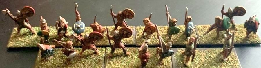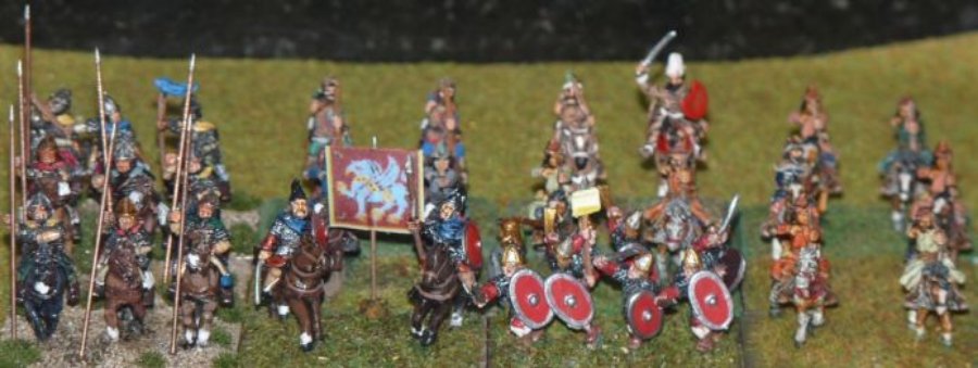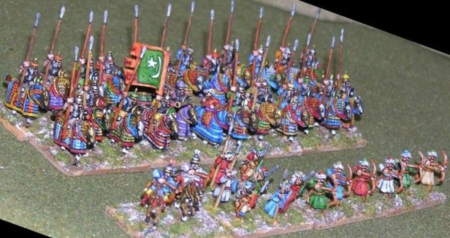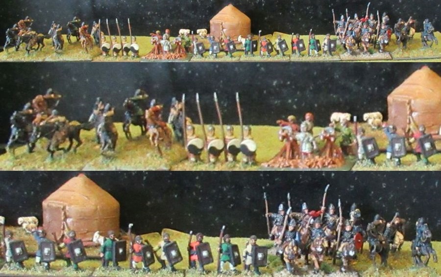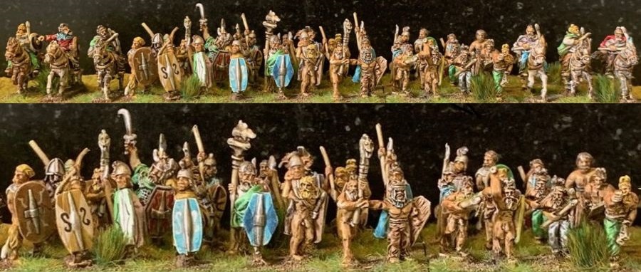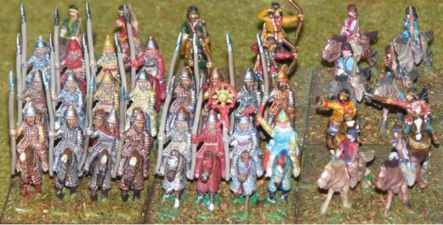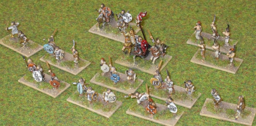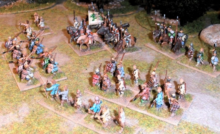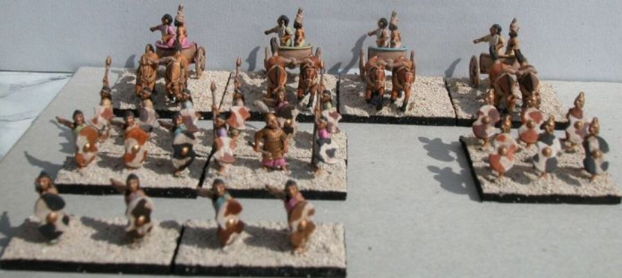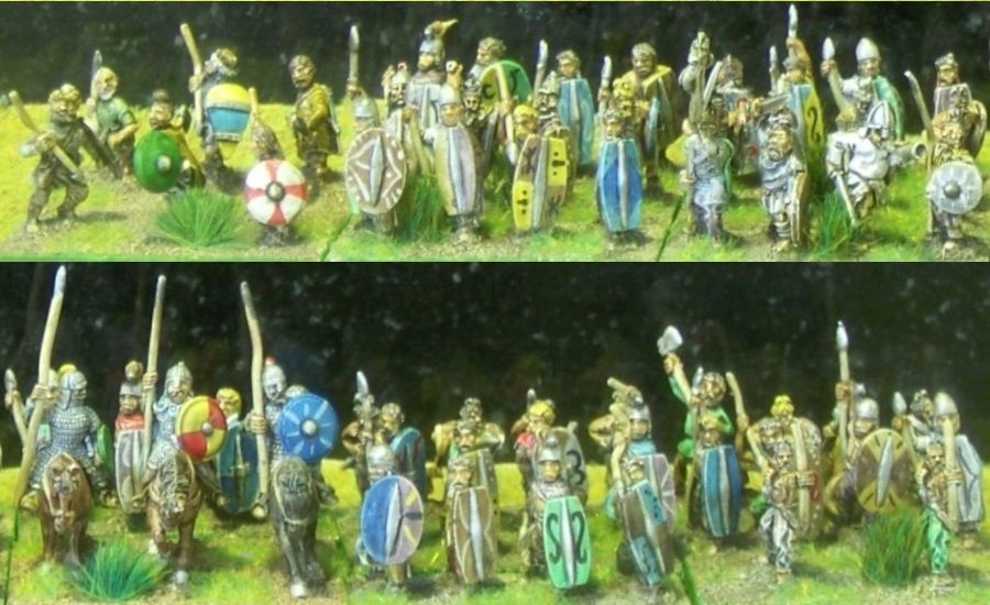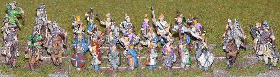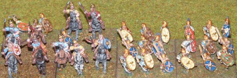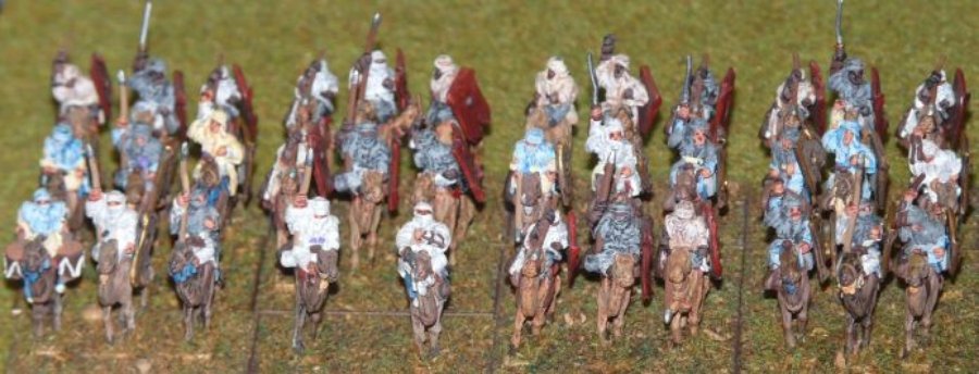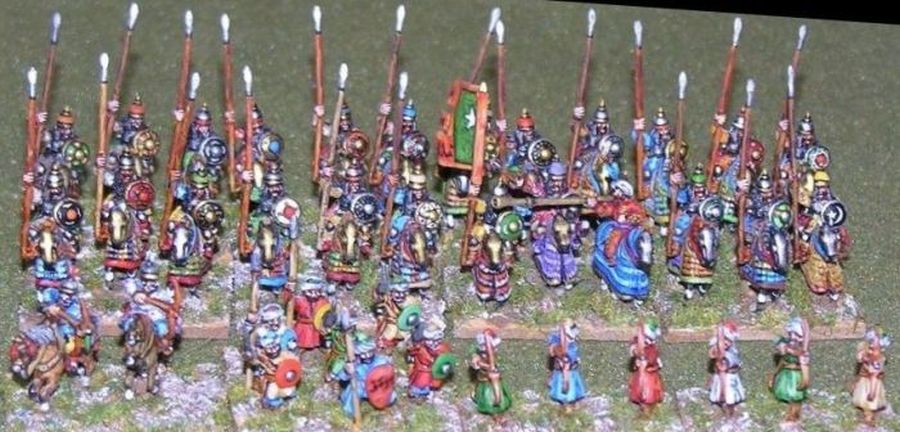meine DBA-ArmeenEs wird Zeit, dass ich meine DBA-Armeen ein Bisschen aufliste. Von vielen, auch von zeitweise bevorzugten Armeen, habe ich nie irgendwelche Bilder geschossen. Nach und nach werde ich einige Abbildungen einfügen müssen.I. Streitwagenepoche 3000 bis 500 vZI/14 Frühe N.rdliche Barbaren 2000 bis 315 vZ(c) Europa 2000-1401vZ: 1x3/4St (Gen), 9x3Bo, 2x2Pl (d) Europa 1400-701vZ: 1xLSt oder 4Kl (Gen), 2x4Kl, 1x3Re o 3Sp, 6x3Sp, 1x2Pl o 3Re, 1x2Pl (e) Europa 700-315vZ: 1xLSt (Gen), 1xLSt, 1x3Re oder 3St, 8x3St, 1x2Pl ![]() I/18 Minoer + Frühe Mykenische Griechen 1600 bis 1250 vZ 1xSSt (Gen), 3xSSt oder LSt, 4x4Pk, 1x3Hi oder 2Pl, 3x2Pl I/24 Hethiterreich 1380 bis 1180 vZ ![]() (a) 1380-1275vZ: 1xLSt (Gen), 3xLSt, 6x3Sp, 2x2Pl I/26 Späte Mykenische Griechen + Trojanischer Krieg 1250 bis 1190 vZ ![]() (a) Achäer: 1xLSt//4Kl (Gen), 3xLSt//4Kl, 4x4Sp, 2x4Sp oder 4St oder 4Pk, 2x2Pl ![]() (b) Trojaner: 1xLSt//4Kl (Gen), 3xLSt//4Kl, 4x4Sp, 1x3Hi, 1x4Sp oder 3Kl, 2x2Pl I/43 Kimmerier, Skythen oder Fr?he Hu 750 bis 50AD (a) 750 vZ bis 301 vZ: 1x3Re oder 2LR (Gen), 8x2LR, (2x2Pl + 1x7Hd oder 3Hi) oder 3x2LR (b) 300 vZ bis 50AD: 1x3Ri (Gen), 8x2LR, (2x2Pl + 1x7Hd oder 3Hi) oder 3x2LR I/47 Illyrer 700 vZ bis 10: 1x2LR (Gen), 9x3Hi, 2x2Pl ![]() I/48 Thraker 700 vZ bis 46: 1x3Re (Gen), 3x2LR oder 3Hi, 6x3Hi, 2x2Pl ![]() II. Klassisches Altertum 500 vZ bis 476II/5 Späte Griechische Hopliten 450 bis 275 vZ(a) Spartaner: 1x4Sp (Gen), 8x4Sp, 1x4Sp oder 4Hi, 1x4Sp oder 3Re, 1x2Pl (b) Athener: 1x4Sp (Gen), 1x3Re, 1x2LR, 7x4Sp, 1x4Sp oder 3/4Hi, 1x2Pl (c) Thebaner: 1x4Sp (Gen), 2x3Re, 6x4Sp, 1x4Sp oder 4Hi, 2x2Pl (d) Thessalier: 1x3Re (Gen), 3x2LR oder 3x3Re, 6x4Sp, 2x2Pl oder 4Hi (e) ?toler o Akarn?er; 1x4Sp (Gen), 3x4Sp, 7x2Pl, 1x2LR (f) Phokier: 1x4Sp (Gen), 1x4Sp, 4x4Hi, 3x2Pl, 1x3Re, 2xArt oder 2Pl (i) andere: 1x4Sp (Gen), 1x3Re oder 4Sp, 7x4Sp, 2x4Sp oder 4Hi oder 2Pl, 1x2Pl II/8b Kampanier 420 bis 203 vZ ![]() 1x3Re (Gen), 1x3Re, 4x4Sp 4x4Hi, 2x2Pl II/8c Apulier 420 bis 203 vZ ![]() 1x3Re (Gen), 2x3Re, 7x4Hi, 2x2Pl II/10 Römer seit Camilius 400 bis 275 vZ ![]() 1x3Re (Gen), 1x3Re, 3x4Kl, 5x4Sp, 2x2Pl II/11 Kelten 400 bis 50 vZ ![]() 1x3/4St oder LSt (Gen), 2xLSt oder 3Re, 8x3St, 1x2Pl II/12 Alexanders Makedonen 355 bis 320 vZ 1x3Ri (Gen), 1x3Re, 1x2LR, 1x4Hi, 6x4Pk, 1x2Pl, 1x4Sp oder 4Hi oder 2Pl oder Art II/13 Samniter 355 bis 272vZ ![]() 1x3Re (Gen), 11x4Hi II/14 Kappadokier 330 bis 322vZ & 300vZ bis 17 1x3Re (Gen), 2x3Re, 2x2LR, 5x3Hi, 2x2Pl II/15 Alexanders Reichsheer 328 bis 320 vZ 1x3Ri (Gen), 1x3Ri, 1x2LR, 6x4Pk, 1xArt oder El, 1x3/4Hi oder 2Pl, 1x2Pl II/17 Lysimachos 320 bis 281 vZ: 1x3Ri (Gen), 1x2LR, 4x4Pk, 4x3Hi, 1x2Pl, 1x4Sp II/19 Seleukiden 320 bis 83 vZ (a) 320-280vZ: 1x3Ri (Gen), 1x3Ri, 1x2LR, 4x4Pk, 1x3/4Hi, 2xEl, 2x2Pl (b) 279-205vZ: 1x3Ri (Gen), 1x3Ri, 4x4Pk, 1x3/4Hi, 1xEl, 1x 4Hi, 1x2Pl oder 4St, 2x2Pl (c) 204-167vZ: 1x3/4Ri (Gen), 1x4Ri, 4x4Pk, 1xSiS, 1xEl, 1x3Re oder 3Hi, 1x4St, 2x2Pl (d) 166-83vZ: 1x4Ri (Gen), 1x4Ri, 1x2LR oder 3Re, 1x4Kl, 4x4Pk, 1x4Hi oder El, 1x4Hi, 2x2Pl II/24 Frühe Rhoxolaner 310 vZ bis 100 ![]() 1x3Ri(Gen),7x3Re, 3x3Ri o 3Re o Pl, 1xLR o 3Re II/25 Ponter, Schwarzmeer-Sarmaten 310 bis 107vZ & 46vZ bis 375 1x3Ri (Gen), 3x3Ri, 4x4Hi, 1x2Pl, 1x2Pl o Art, 2x2Pl o 3Bw II/26 Siracaer, Iazygen, Sp?te Rhoxolaner, Sarmaten 310 vZ bis 375 ![]() 1x3Ri (Gen), 8x3Ri, 1x2LR oder 3Ri, 2x2Pl oder 3Ri II/28 Frühe Armenier und Gordyener 300vZ bis 627 (a) Tigraner 83-69vZ: 1x4Ri (Gen), 1x4Ri, 2x2LR, 1 x4Kl, 2x4Pk, 3x3Hi, 2x2Pl (b) ?brige Armenier 300vZ bis 244: 1x4Ri (Gen), 1x4Ri, 4x2LR, 4x3Hi, 2x2Pl (c) Armenier 245-627: 1x3Re (Gen), 1x3Re, 4x2LR, 4x3Hi, 2x2Pl (d) Gordyener 147vZ bis 225: 1x4Ri (Gen), 1x4Ri, 4x2LR, 4x3Hi, 1x2Pl, 1xArt oder 2Pl II/30 Galater 280 bis 25vZ (a) 280-273vZ: 1xLCh(Gen), 1xLCh, 1x3Re, 8x4St, 1xLCh oder 3Re (b) 272-48vZ: 1xLCh oder 3Re(Gen), 2x3Re, 8x4St, 1x2Pl (c) 47-25vZ: 1x3Re (Gen), 2x3Re, 2x4Kl, 6x4St, 1x2Pl II/33 Römer seit Polybius 275 bis 105vZ 1x3Re (Gen), 1x3Re, 6x4Kl, 2x4Sp, 2x2Pl II/36 Baktrische Griechen 250 bis 130 vZ + Baktrische Inder 170 bis 55 vZ (a) Baktr. Griechen: 1x3Ri (Gen),1x3Ri, 2xLR, 4x4Pk + 2x4Hi + 1x2Pl o El + 1x2Pl o 3Bw (b) Baktr. Inder: 1x3Re (Gen), 1x2LR, 4x4Pk, 2xEl, 2x3Bo, 1x4Kl, 1x2Pl II/37 Parther 250 vZ bis 225 ![]() 1x4Ri (Gen), 1x4Ri, 2x4Ri oder 2LR oder 2Pl, 1x4Ri oder 2LR oder 3Hi, 7x2LR II/38 Hsiung-nu oder Juan-juan 250vZ bis 555 (a) Hsiung-nu 250vZ bis 304: 1x3Re (Gen), 2x3Re, 8x2LR, 1x2LR oder 2Pl (b) südl. Hsiung-nu 304-439: 1x4Ri (Gen), 1x4Ri, 6x2LR, 3x3Hi, 1x2Pl (c) Juan-juan 308-555: 1x3Re (Gen), 1x3Re, 9x2LR, 1x2LR oder 2Pl II/39 Spanier 240 bis 20vZ ![]() (a) Iberer: 1x3Re (Gen), 1x2LR, 6x3Hi, 4x2Pl ![]() (b) Keltiberer: 1x3Re (Gen), 1x2LR, 6x3St, 4x2Pl (c) Lusitanier: 1x3Re (Gen), 1x2LR, 3x3Hi, 6x2Pl, 1x3St oder 4Kl oder 2Pl II/41 Hanchinesen 202vZ bis 189 ![]() II/47g Frühe Germanen 115 vZ bis 250: (a) Kimbern & Teutonen 113-102vZ: 1x3Re (Gen), 1x3Re, 9x4St, 1x2Pl (b) Ariovist in 58vZ: 1x4St (Gen), 2x3Re, 8x4St, 1x2Pl ![]() (d) Batavier: 1x3Re (Gen), 9x3St, 2x2Pl ![]() (f) Tenkterer: 1x3Re oder 4St (Gen), 1x2LR, 9x4St, 1x2Pl ![]() ![]() 1x3Re(Gen), 1x3Re oder 2LR, 8x4Kl, 1x3/4Hi oder 2Pl, 1x2Pl II/52 Daker 60vZ bis 106 und Carpi l06 bis 380 ![]() II/53 Briten 55vZ bis 75: 1xLCh(Gen), 2x2LR, 3xLCh o 2Pl o 3St, 5x3St, 1x3St o Pl II/54a Iro-Schotten oder Gälen ![]() II/56 Römisches Imperium 25vZ bis 197 1x3Re oder 4Kl (Gen), 1x3Re, 1x3Re oder 2LR oder 4Bw oder 2Pl, 4x4Kl, 4x4Hi, 1xArt. ![]() ![]() 1x3Ri oder 2LR (Gen), 5x2LR, 3x2LR oder 3Ri; 2x2LR oder 4Kl, 1x2LR oder 2Pl II/60 Kaledonier 75 bis 211: 1xLCh oder 3/4St (Gen), 2xLCh, 8x3St, 1x3St oder 2Pl II/64 Römisches Imperium 193 bis 324 (a) West: 1xRe(Gen), 1xRe o 3Ri, 1x2LR, 1x3Kl, 3x4Kl, 3x4Hi, 1x4Hi o 4Bw o 2Pl, 1xArt ![]() ![]() ![]() (b) sonst: 1x3Ri oder 4St (Gen), 1x3Ri, 8x4St, 2x2Pl II/66 Vandalen 200 bis 442: 1x3Ri (Gen), 9x4St, 1x2LR oder 2Pl, 1x2Pl II/67 Ostrogoten, Heruler, Sciren oder Tabeiali 200 bis 493 1x3Ri (Gen