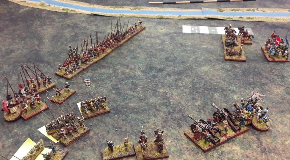 ...die französischen Geschütze hinter vorbereiteten Stellungen... ...französische Landsknechte bewachen das Hauptquartier, Figuren von Markus... ...gespielt wurde nach DBA-RRR-Regeln für die Ranaisance mit 2 3er-Teans & Markus als Unparteischen... ...unten die Eidgenossen... ...die Venezianer waren eigentlich Korbis Figuren, die historisch gesehen versucht haben, das Schlachtfeld noch rechtzeitig zur Schlacht zu erreichen... ...hier versuchen die Venezianer, mit ihrer überlegenen Reiterei ins Geschehen einzugreifen... ...aber da waren die eidgenössischen Linien auf dem ganzen Feld zersplittert & vom steten Beschuss dezimiert... ...mehr zu unseres Schlacht, die wir übrigens 2 mal ausgefochten haben, in Blog von Markus...