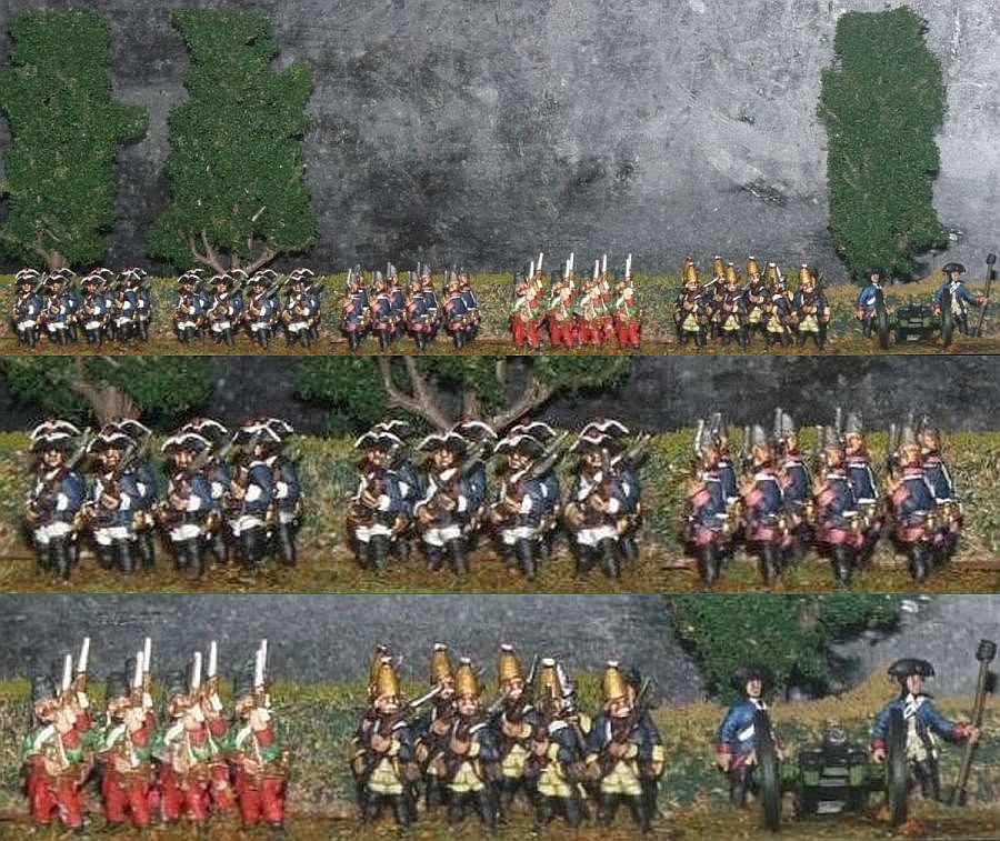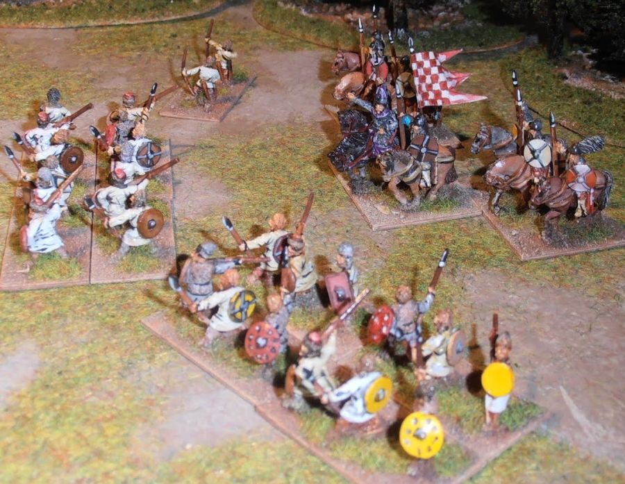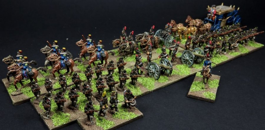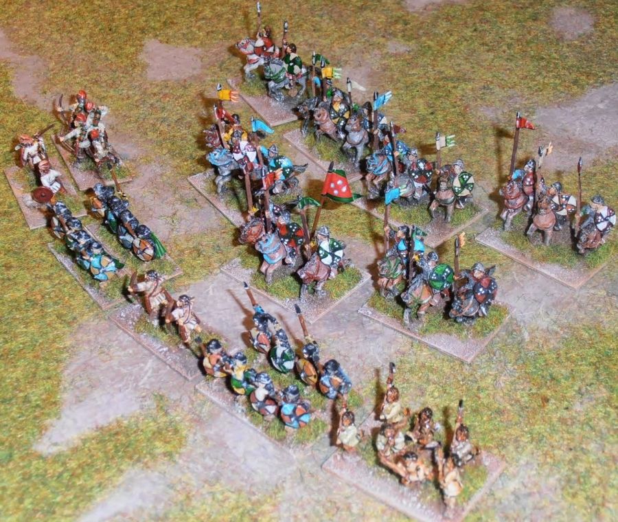 Auxilia Einheiten hatten bei DBA 3 oder 4 Mann pro Base. Inzwischen sind unter Triumph! 4 Raiders daraus geworden. Bei DBMM stellen sie reläre Auxilia dar. Rechtzeitig zum Finale der deutschen Einigungskriege 1866, habe ich meine verschiedenen deutschen Staaten bekommen. Die Österreicher & Italiener hatte ich ja schon. Die Preussen & Bayern hat mir vor X Jahren Phil Riney bemalt. Hanchinesen Petschenegen - die Irokesen am linken Bildrand sind gar nicht da...