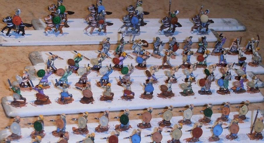Meine 7JK-Preussen & beide ACW-Armeen habe ich in Sri Lanka bemalen lassen. Die Nordstaatler von Fernando, die Rebellen später von Philgreg. Auch die Trojaner mit den grossen Kuhhatschilden hat Philgreg bemalt, nach Vorlage. ..auch die Piemonterarmme der italienischen Einigungskriege habe ich bei Philgreg bemalen lassen,Massenweise dieselben Uniformet kopieren... Im Fanatikus Forum habe ich von Timurilank bemalte Figuren entdeckt.Es bot dort unter Anderem bemalte DBA-Armeen an; Alemannen: Ich habe diese Armee, sowie andere Drk Age-Armeen von ihm bestellt & sorgfältig verpackt per Post bekommen. Danach habe ich ihn gefragt, ob er für mich weitere DBA-Armeen bemale. Von ihm habe ich einige Armeen bemalt & asiert erstanden. Er hat mir immer die Etappen des Malauftrags dokumentiert. Norddeutsche Sachsen, teilweise ATF-Figuren, die untere Reihe Speerträger sind von Metal Magic. ...links die Reiterei, unten die Stammeskrieger, oben der Schildwall der Altsachsen. Tumurilanks Blog: Storm within the Empire Während der Koronazeit hat er meine Dog People & Mapuche bemalt & basiert. Weitere Armeen von Timurilank: Kampagnier Apulier Abodriten Karolinger Wenden