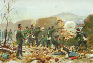 | | Die Erstürmung der Düppeler Schanzen am 18. April 1864. Abteilungen des 3.+ 4. Garde Regiments erobern Schanze I. Da die Londoner Friedenskonferenz auf Bismarks Betreiben vom 12. auf den 20. April verschoben wurde, hatten die Verbündeten genug Zeit, die Düppeler Schanzen zu erobern. Die Beteiligung Österreichs in diesem Krieg, auch von Bismark bewirkt, die den verlorenen Italienfeldzug vergessen helfen sollte, verhalf aber Preussen zur Vormachtstellung im damaligen deutschen Staatenbund. |