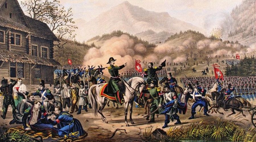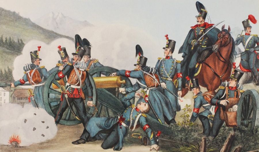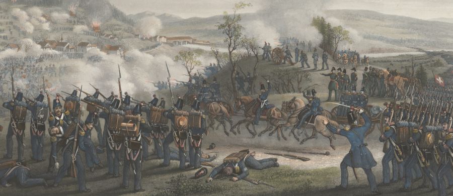 Geschichtlicher HintergrundIn den 1830er Jahren kam es zu einer Polarisierung der Positionen zwischen Anhängern der alten Ordnung (Konservative) und Verfechtern einer Modernisierung des Bundesvertrags (Radikale und Liberale).Die Aufhebung der aargauischen Klöster im Jahre 1841 und die Berufung der Jesuiten nach Luzern waren das Resultat. Zwei Freischarenzüge in den Jahren 1844 und 1845, als radikale Luzerner mit Unterstützung von Gesinnungsgenossen aus anderen Kantonen gegen die Machthaber Luzerns einen Staatsstreich versuchten, scheiterten. Angesichts dieser Eskalierung schlossen sich die 7 katholisch-konservativen Orte; Luzern, Zug, Schwyz, Oberwalden, Uri, Freiburg, Wallis zum sogenannten "Sonderbund" zusammen. Sein Ziel war die Erhaltung der kantonalen Souveränitätstsrechte gegen die Einflussnahme eines zentralistischen Einheitsstaates. Es wurde ein Kriegsrat geschaffen und der konservative Bündner Protestant Ulrich von Salis-Soglio zum Oberkommandierenden ernannt. Zudem rief man den alten Erzfeind Österreich zu Hilfe. Die Empörung ob dieses Schutzbündnisses war auf Seiten der Liberalen gross. Am 20.Juli 1847 wurde in der Tagsatzung mit die Auflösung des Sonderbundes beschlossen, da dessen Legalität stark bezweifelt wurde. Der KriegsverlaufDie Armee der Mehrheitskantone war den Sonderbundstruppen eindeutig überlegen. Dufour hatte sich zu einer Offensive in 3 Phasen entschlossen. Nach der Einnahme des isolierten Freiburgs sollte die geballte Kraft des eidgenössischen Heeres gegen die Innerschweiz marschieren und zuletzt das Wallis bezwingen.Tatsächlich kapitulierte Freiburg schon 2 Tage, nachdem der Belagerungsring geschlossen worden war, sodass der Angriff gegen Luzern lanciert werden konnte. 5 Divisionen marschierten von Norden und Westen her Richtung Stadt Luzern, wobei die Schwerpunkte der Offensive einerseits im Entlebuch, andererseits zwischen Reuss und Zugersee lagen. Nach der unblutigen Kapitulation Zugs kam es am 23.November zu den entscheidenden Gefechten bei Schüpfheim, Gisikon und Meierskappel, wo die eidgenössischen Verbände die Front durchbrachen. Am nächsten Tag konnten sie kampflos in Luzern einmarschieren. Der Widerstand in den anderen Kantonen brach schnell zusammen und bis zum 28. November kapitulierten alle übrigen Orte; die Offensive gegen das Wallis konnte abgebrochen werden. KriegsfolgenDie Lösung des Konfliktes, der dem kurzen Krieg zugrunde lag, brachte die neue liberale Bundesverfassung, die 1848 angenommen wurde - Beispiel und Motivation für die liberalen Bewegungen in anderen Ländern.Tote: etwa 128
