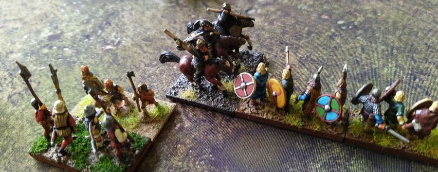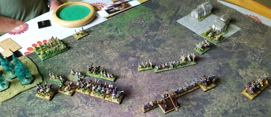 ...mein erster Versuch mit Iren, Nordiren nach 850 um genau zu sein; gegen Markus mit Wikingern. Ab 850 können die Wikinger eine Kampfkarte einsetzen, die belibig viele Kämpfer als mobiles Fussvolk einsetzen können. Das bedeutet, dass solche Truppen das Schlachtfeld schneller erreichen können. Diese Kampfkarte ist nur wenigen Armeen vorbehalten und macht die Wikinger nach 850 zu einer wahren Killerarmee... |
