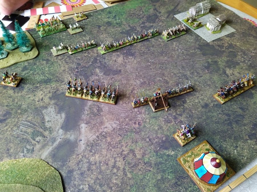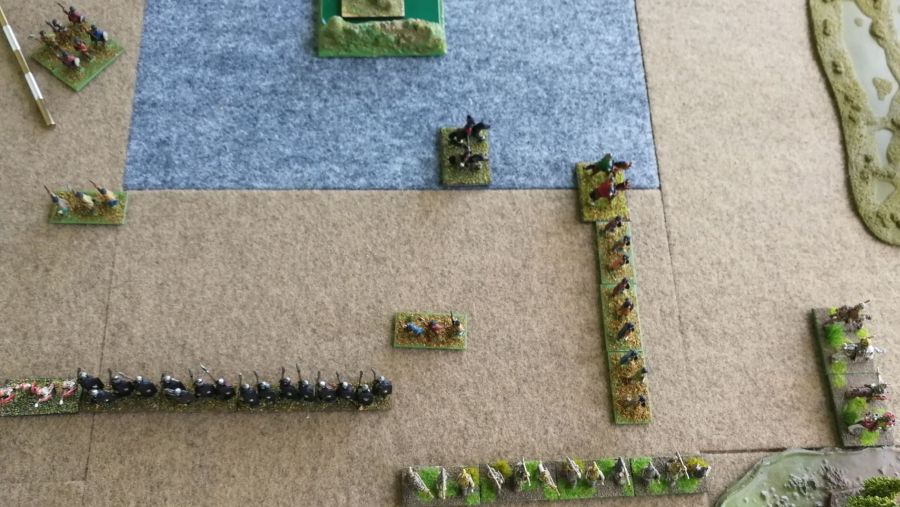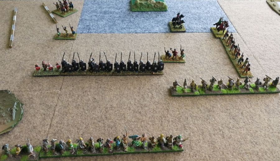 ...mit 3 Geländestücken relativ wenig Gelände. Also musste die bessere Taktik entscheiden. Ein unverhoffter Flankenanagriff mit schnellen Reitern zwingt den Gegner mit den grossen Schilden zu reagieren und eine Frnot aufzubauen, die aber auch von gegnerischen leichten Truppen in der Flanke bedroht werden... |